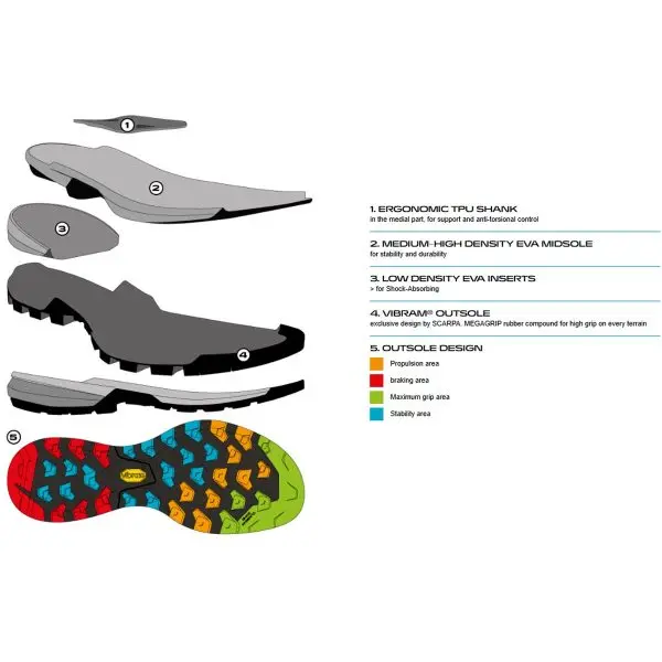 - EXO – Sistem de constructie al partii superioare dezvoltat de SCARPA. Protectii laterale combinate cu partea superioara creeaza un exoschelet pentru protectie, suport si control.